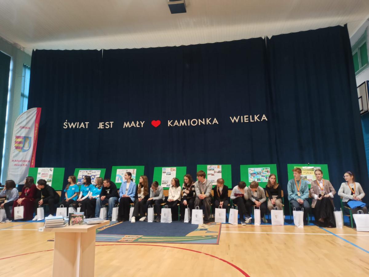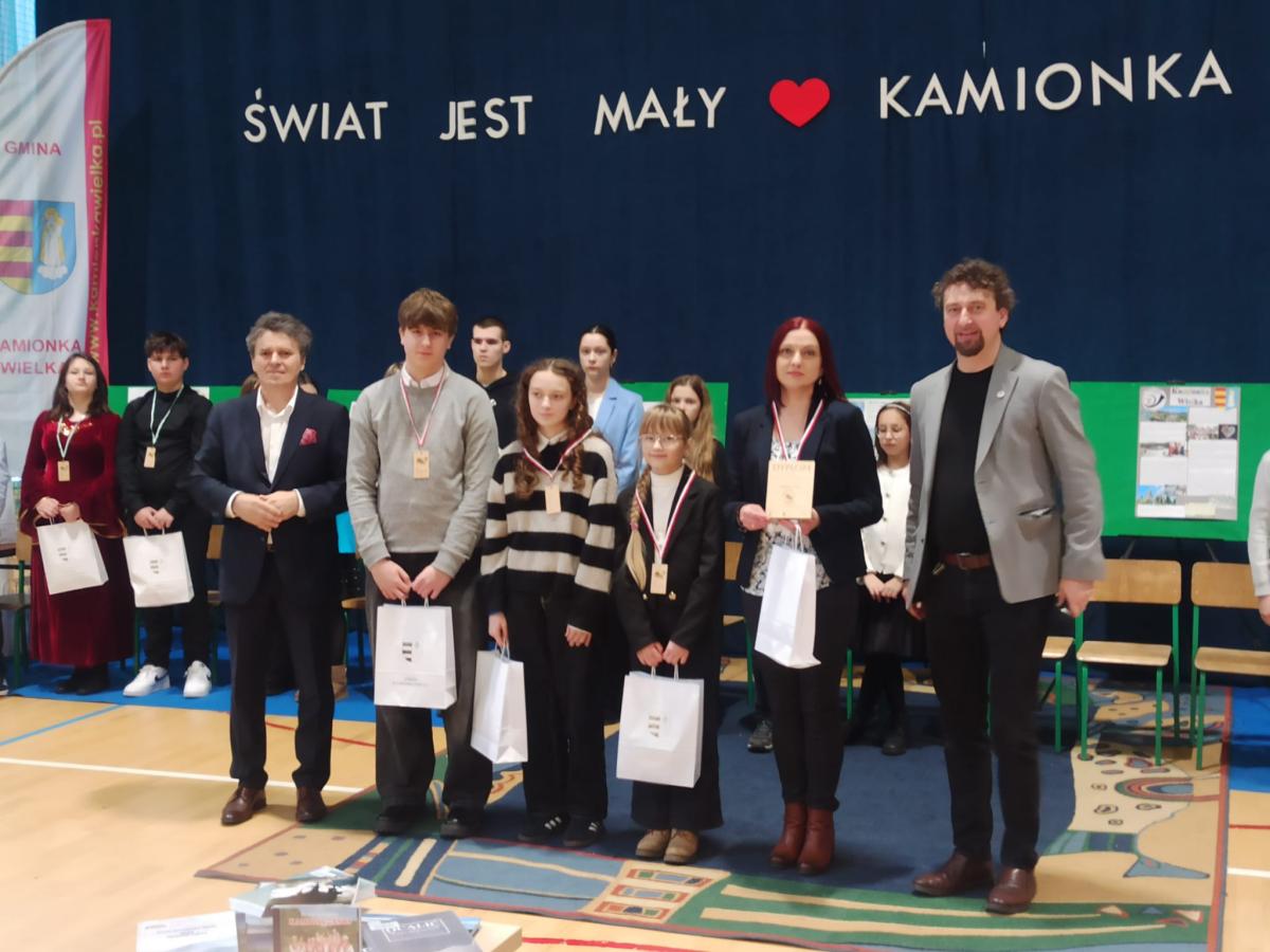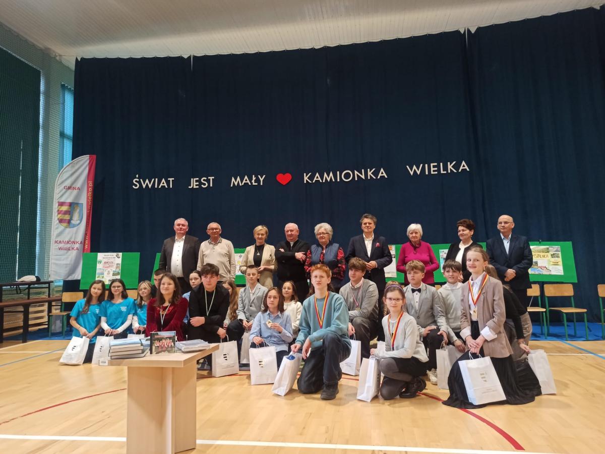 Konkurs miał charakter drużynowy. Naszą szkołę reprezentowali: Ewelina Kruczek z kl. 4a, Julia Pawłowska i Mateusz Kocemba z kl. 8a. Konkurs składał się z dwóch etapów. W pierwszym etapie uczniowie rozwiązywali test sprawdzający wiedzę o Gminie Kamionka Wielka i prezentowali przygotowany plakat promujący wybraną miejscowość w gminie. W drugim etapie odbył się teleturniej, w którym drużyny odpowiadały na wylosowane pytania. Rywalizacja była niezwykle zacięta i do ostatniej minuty drużyny walczyły o zdobycie punktów dla swojej szkoły. Jesteśmy pod ogromnym wrażeniem wiedzy na temat historii, geografii, kultury oraz lokalnych tradycji Gminy Kamionka Wielka, którą wykazali się wszyscy uczestnicy konkursu. Serdecznie gratulujemy uczniom z naszej szkoły zajęcia III miejsca w konkursie. Podziękowania kierujemy również do opiekuna pani Moniki Kłębczyk za nieocenione wsparcie i pomoc w przygotowaniu uczniów do konkursu.