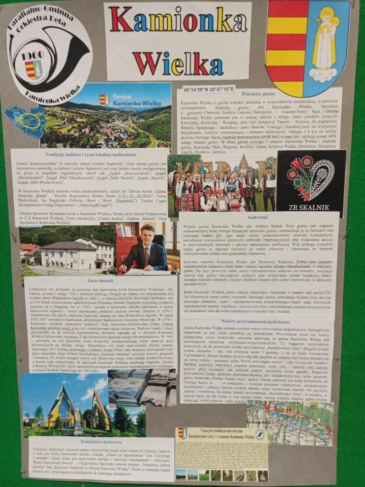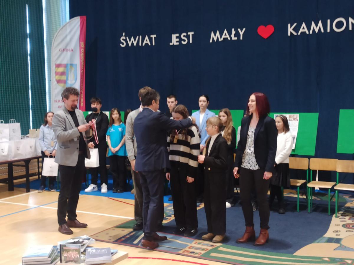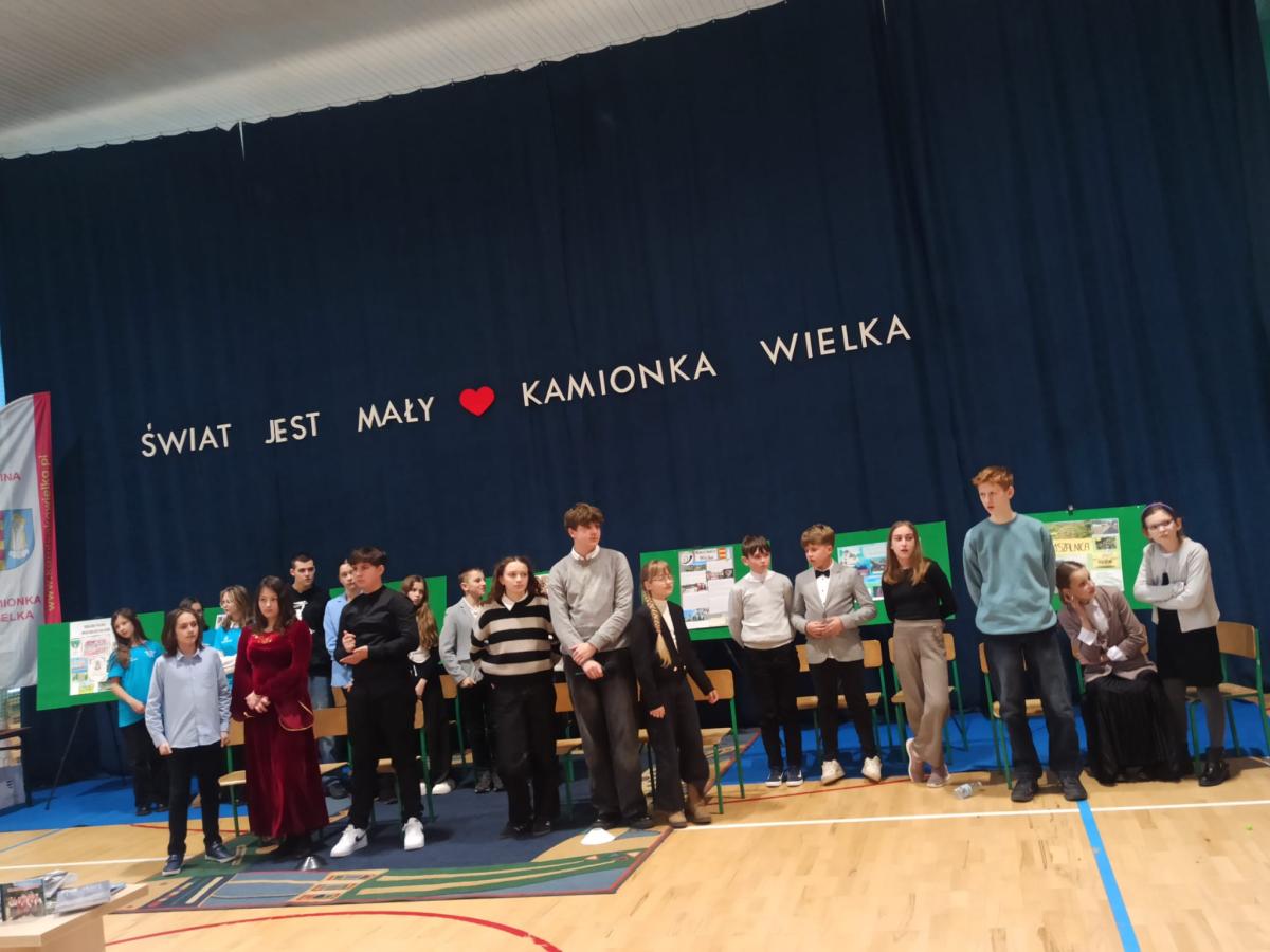 Konkurs miał charakter drużynowy. Naszą szkołę reprezentowali: Ewelina Kruczek z kl. 4a, Julia Pawłowska i Mateusz Kocemba z kl. 8a. Konkurs składał się z dwóch etapów. W pierwszym etapie uczniowie rozwiązywali test sprawdzający wiedzę o Gminie Kamionka Wielka i prezentowali przygotowany plakat promujący wybraną miejscowość w gminie. W drugim etapie odbył się teleturniej, w którym drużyny odpowiadały na wylosowane pytania. Rywalizacja była niezwykle zacięta i do ostatniej minuty drużyny walczyły o zdobycie punktów dla swojej szkoły. Jesteśmy pod ogromnym wrażeniem wiedzy na temat historii, geografii, kultury oraz lokalnych tradycji Gminy Kamionka Wielka, którą wykazali się wszyscy uczestnicy konkursu. Serdecznie gratulujemy uczniom z naszej szkoły zajęcia III miejsca w konkursie. Podziękowania kierujemy również do opiekuna pani Moniki Kłębczyk za nieocenione wsparcie i pomoc w przygotowaniu uczniów do konkursu.