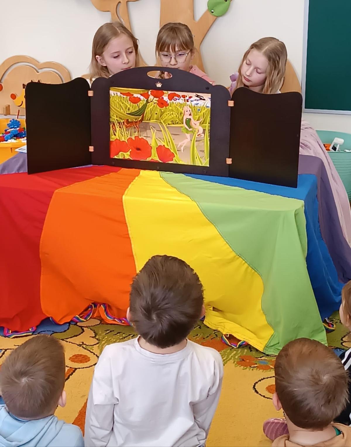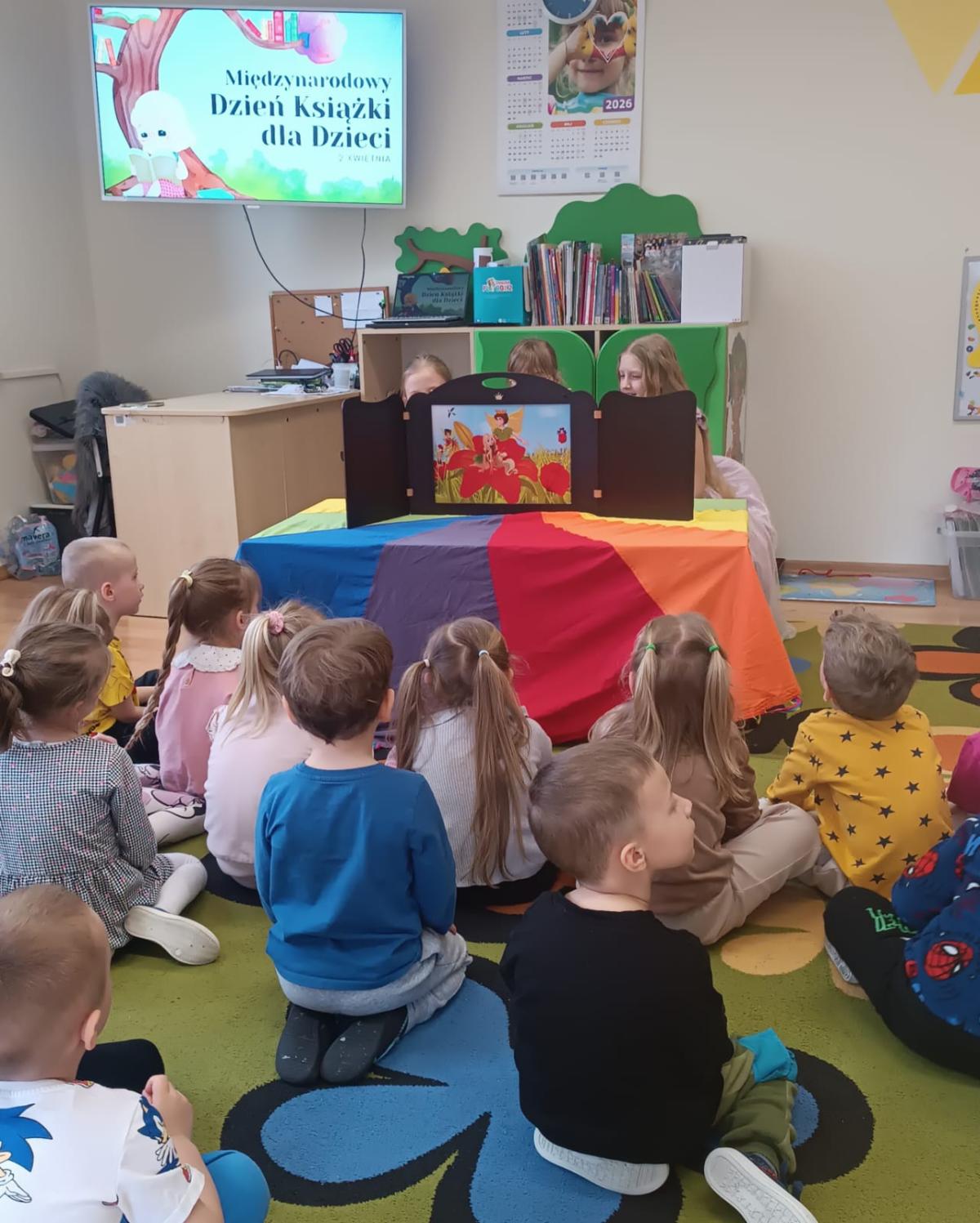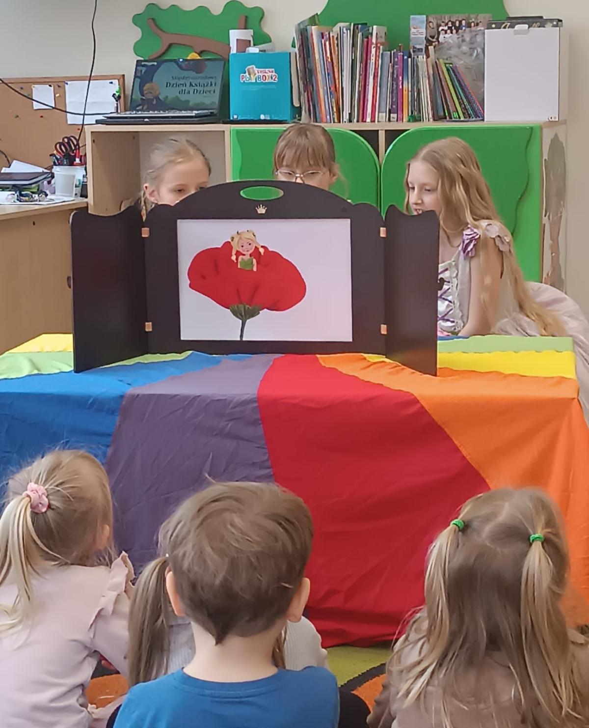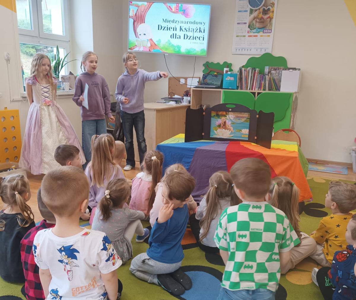 W grupie przedszkolnej Krasnoludków i Motylków odbył się Dzień Książki dla Dzieci 📖🧚 Klub Czytelniczy pod opieką nauczyciela bibliotekarza przeczytał i przybliżył dzieciom baśń H. Ch. Andersena pt. "Calineczka" za pomocą Teatrzyku Kamishibai. Były zagadki, zadania i eksperyment "Rozkwitająca lilia wodna" 🪷, który nawiązywał do baśni oraz pokazał przedszkolakom proste zjawisko kapilarności - papierowe kwiaty z zagiętymi płatkami po położeniu na wodzie "rozkwitają". Dodatkową niespodzianką dla dzieci była uczennica przebrana za tytułową "Calineczkę".