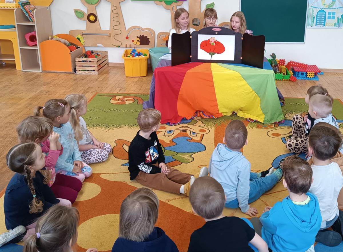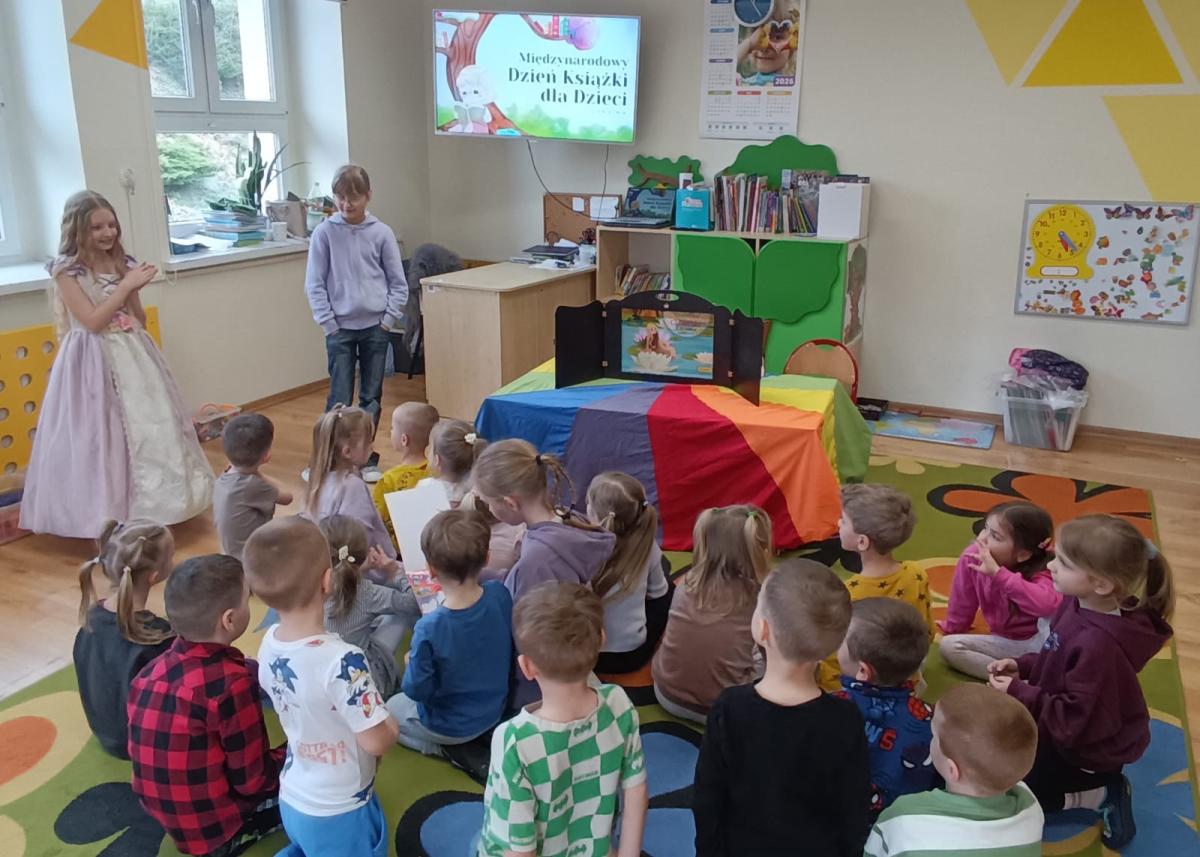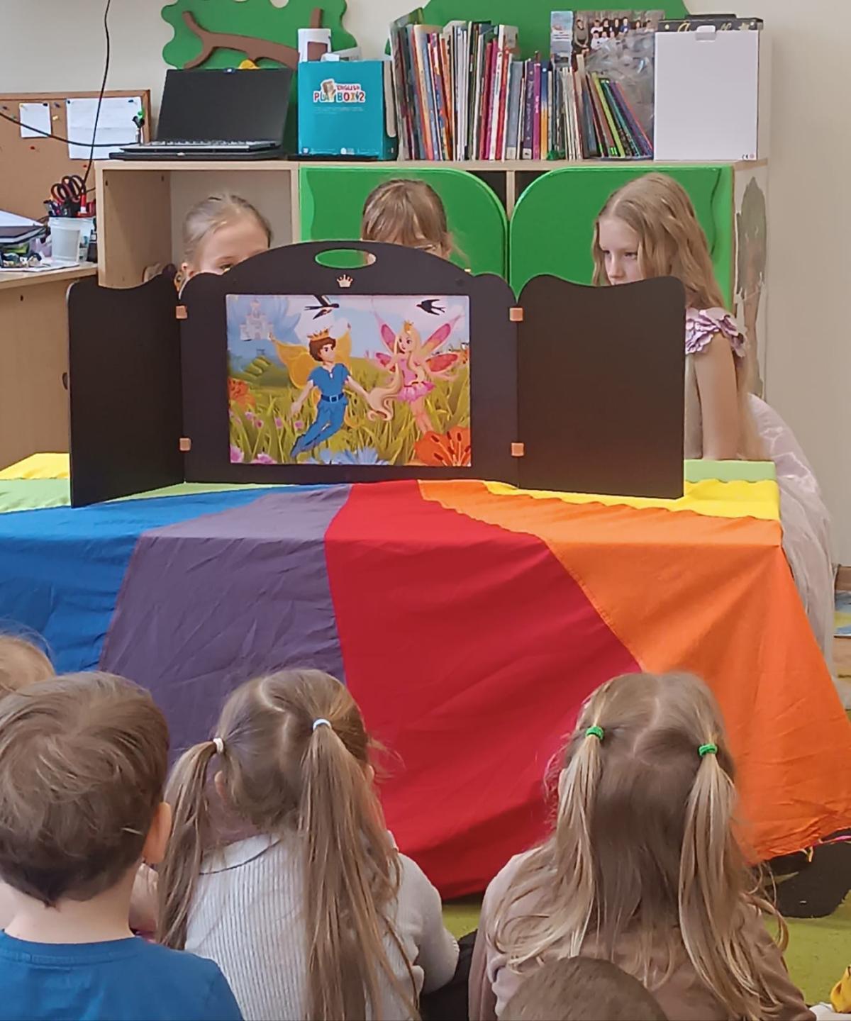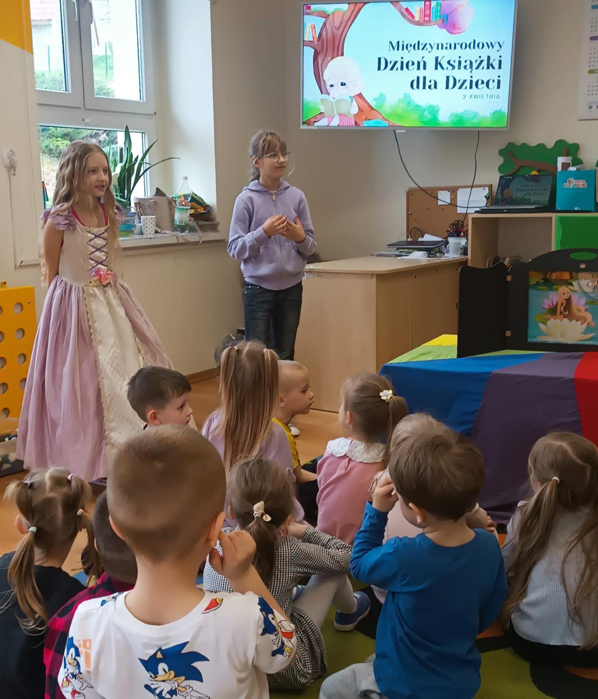 W grupie przedszkolnej Krasnoludków i Motylków odbył się Dzień Książki dla Dzieci 📖🧚 Klub Czytelniczy pod opieką nauczyciela bibliotekarza przeczytał i przybliżył dzieciom baśń H. Ch. Andersena pt. "Calineczka" za pomocą Teatrzyku Kamishibai. Były zagadki, zadania i eksperyment "Rozkwitająca lilia wodna" 🪷, który nawiązywał do baśni oraz pokazał przedszkolakom proste zjawisko kapilarności - papierowe kwiaty z zagiętymi płatkami po położeniu na wodzie "rozkwitają". Dodatkową niespodzianką dla dzieci była uczennica przebrana za tytułową "Calineczkę".