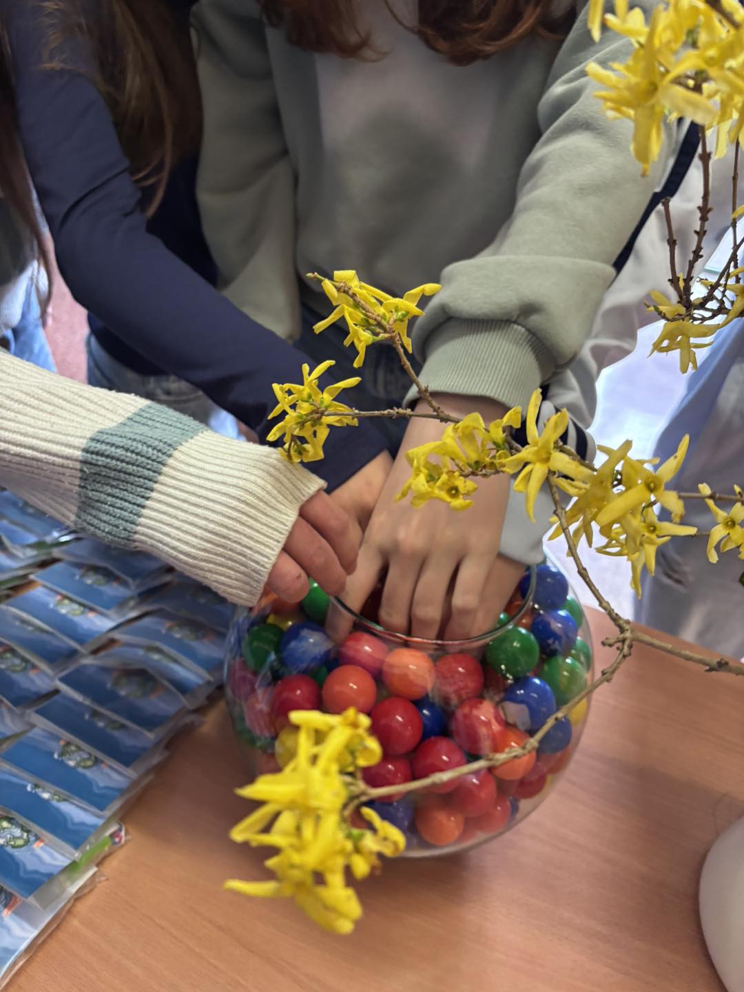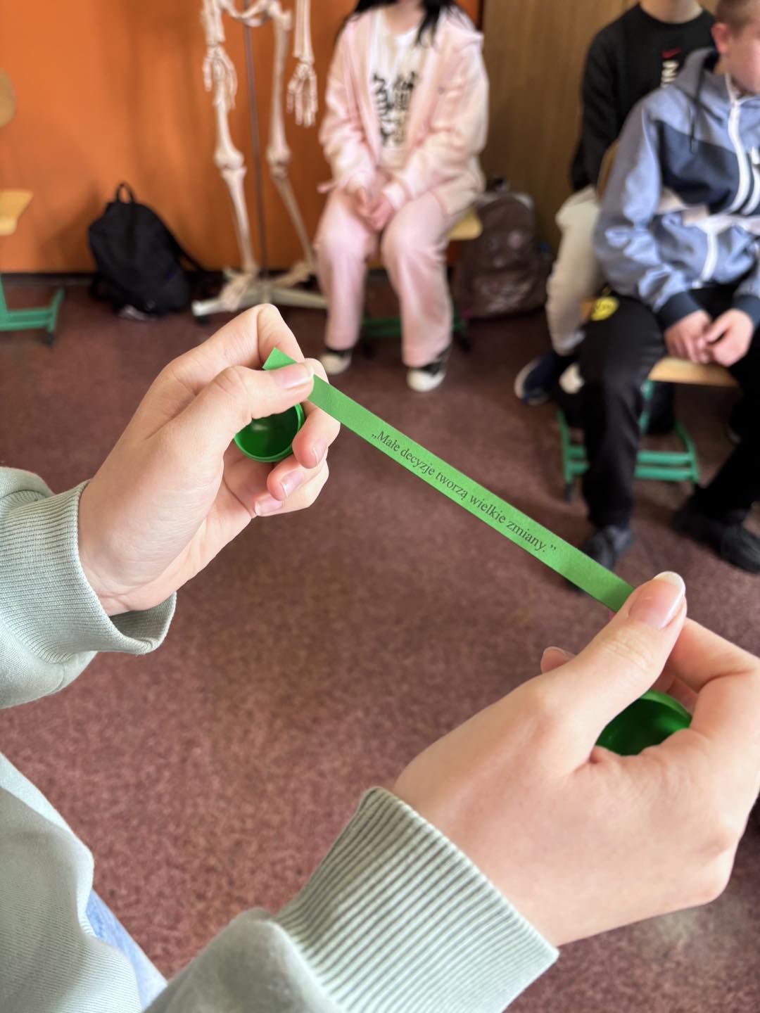 Każdy uczestnik losował ze szklanej kuli kuleczkę, w której kryły się różnorodne zadania: wyzwania, aforyzmy, ciekawostki, pytania, a także puste karteczki – na nich uczniowie mogli zapisać własne pomysły na to, jak dbać o naszą planetę.
