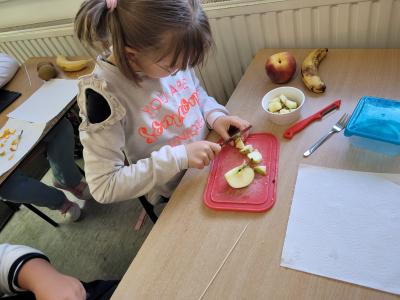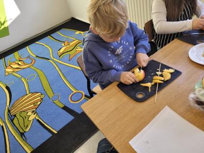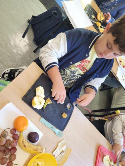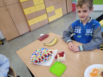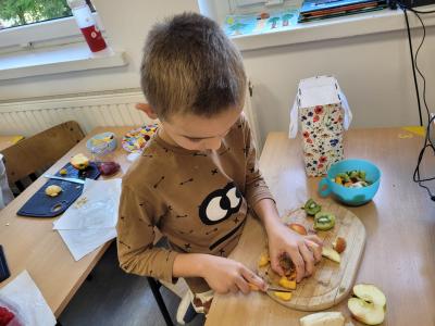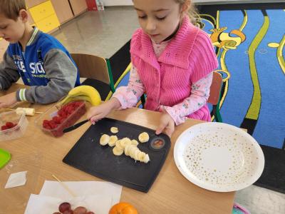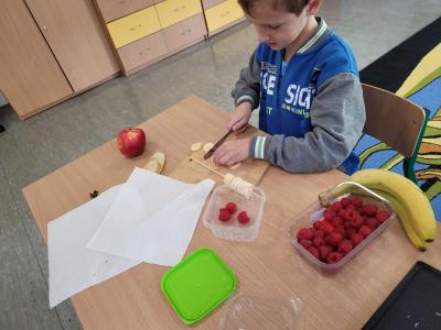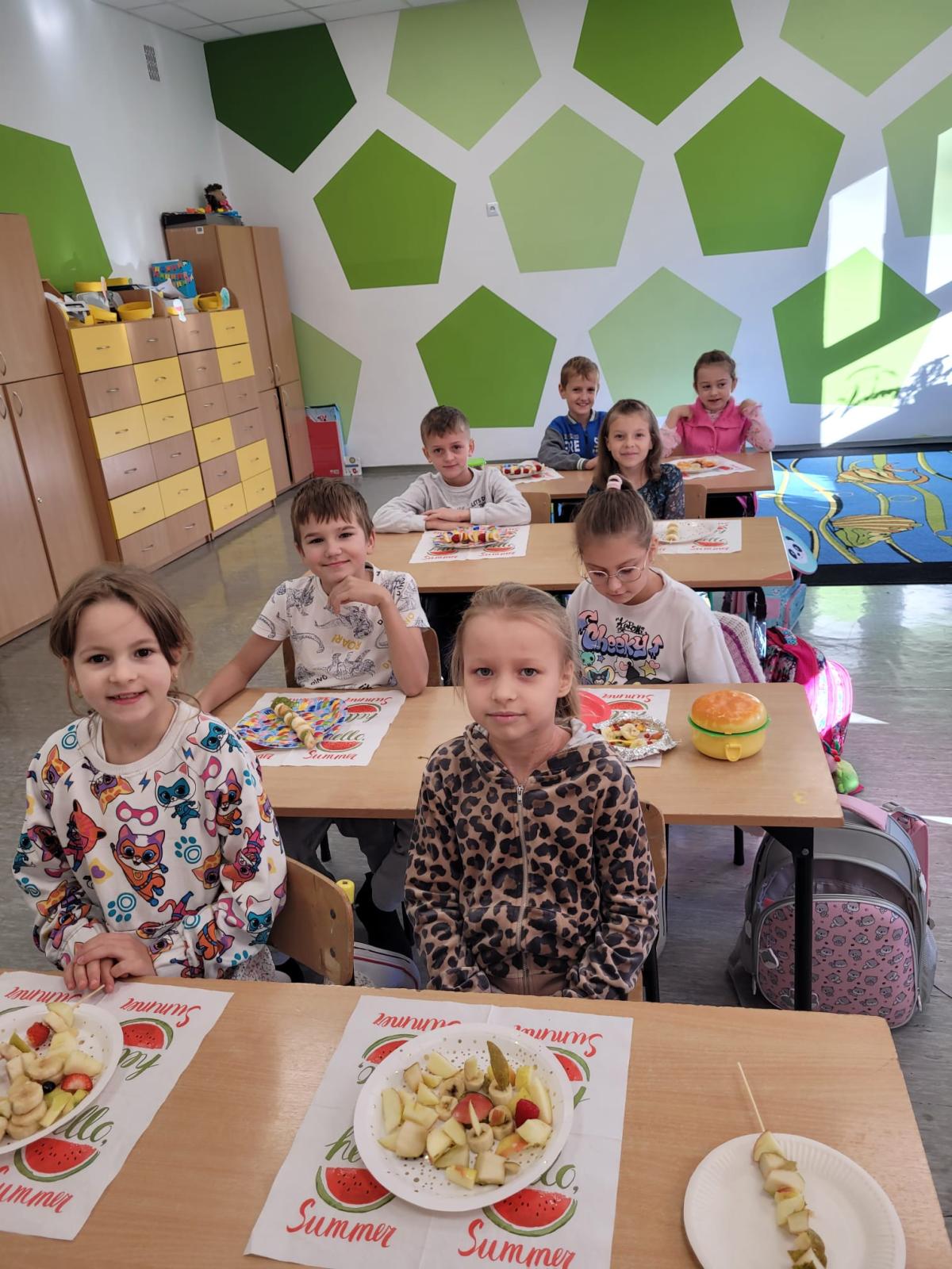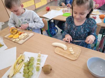 Zajęcia połączyły naukę i zabawę. Dzieci samodzielnie kroiły owoce, komponowały smaki i dbały o estetykę swoich potraw. To była zdrowa, smakowita i pełna radości lekcja. wykorzystano sprzęt kuchenny, zakupiony dzięki Laboraorium Przyszlości