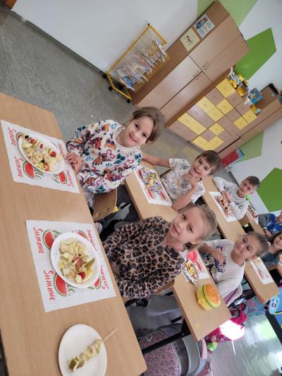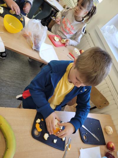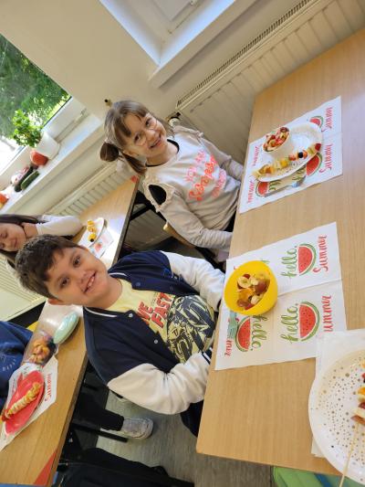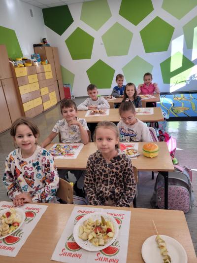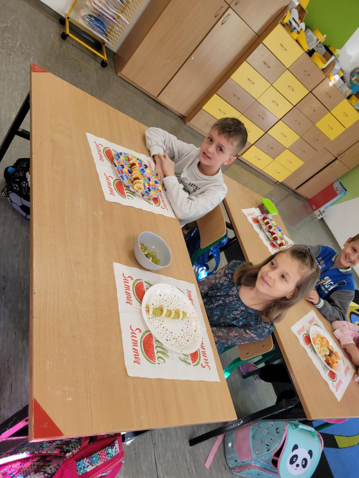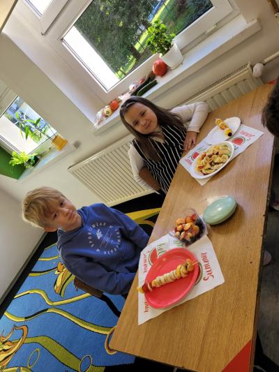 Uczniowie klasy 2 b przygotowywali dziś pyszne i kolorowe sałatki owocowe oraz szaszłyki.